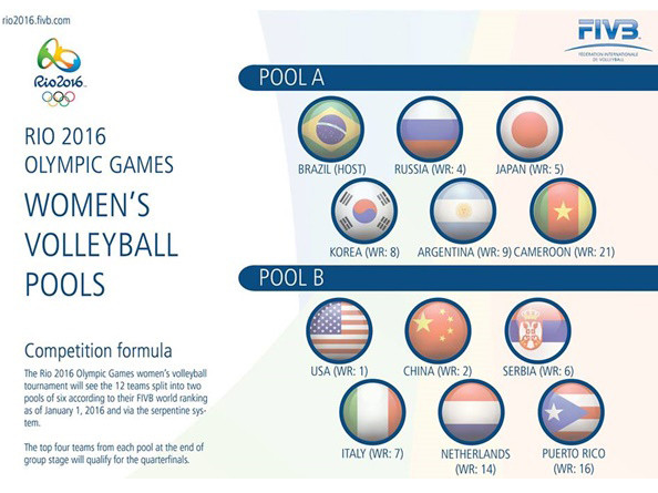 ผลการจับสลากแบ่งสายการแข่งขันวอลเลย์บอลหญิง ในกีฬาโอลิมปิก 2016 ที่นครริโอ เด จาเนโร ประเทศบราซิล ในช่วงเดือนสิงหาคมนี้ซึ่งมีทีมผ่านการคัดเลือกเข้าสู่มหกรรมครั้งนี้ จำนวนทั้งสิ้น 12 ทีมจากทั่วโลก