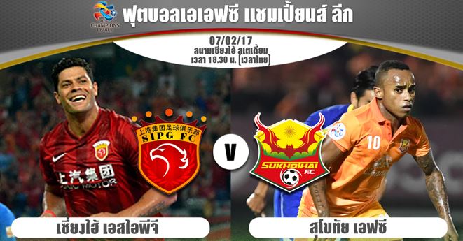 ความเคลื่อนไหวก่อนศึกฟุตบอลชิงชนะเลิศสโมสรเอเชีย “เอเอฟซี แชมเปี้ยนส์ ลีก 2017” รอบเพลย์ออฟด่านสุดท้าย ที่ตัวแทนจากแดนสยามอย่าง “ค้างคาวไฟ” สุโขทัย เอฟซี มีคิวบุกเยือน เซี่ยงไฮ้ เอสไอพีจี ทีมอันดับ 3 ไชนิส ซูเปอร์ลีก พบกับเซี่ยงไฮ้ เอสไอพีจี ทีมยักษ์ใหญ่จากจีนที่สนามเซี่ยงไฮ้ สเตเดี้ยม ในวันที่ 7 ก.พ.นี้ เวลา 18.30 น.ตามเวลาไทยฟ็อกซ์ สปอร์ตส์ (ทรูวิชั่นส์ 680) ถ่ายทอดสด โดยระบบการแข่งขันหากเสมอในเวลา 90 นาทีจะต่อเวลาพิเศษ 30 นาที หากยังเสมออีกจะต้องดวลจุดโทษตัดสิน