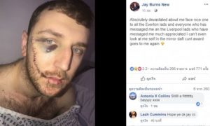 เจสัน เบิร์นส์ แฟนตัวยงของ ‘ทอฟฟี่สีน้ำเงิน’ เอฟเวอร์ตัน ได้โพสต์ภาพบาดแผลของตัวเองลงบน Facebook หลังเขาถูกเฉือนหน้าในระหว่างที่ทุกอย่างกำลังชุลมุน