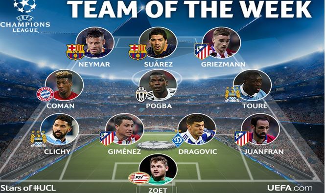 3 ประสาน เอ็มเอสเอ็น หายไปหนึ่ง! ยูฟ่า เปิดโผทีมยอดเยี่ยม ยูฟ่า แชมเปี้ยนส์ ลีก นัดกลางสัปดาห์ออกมาแล้ว โดยมี หลุยส์ ซัวเรซ และ เนย์มาร์ ดาวเตะ บาร์ซ่า นำทัพในแดนหน้าร่วมกับ อองตวน กรีซมันน์ หัวหอก แอตเลติโก มาดริด