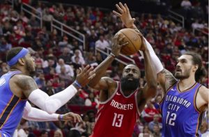 ศึกบาสเก็ตบอลเอ็นบีเอของสหรัฐ เมื่อเช้าวันอาทิตย์ที่ผ่านมาตามเวลาไทย ฮูสตัน ร็อคเกตส์ โดนหยุดสถิติชนะรวดในบ้านไว้ที่ 20 นัดติดต่อกัน หลังถูก โอกลาโฮมา ซิตี ธันเดอร์ บุกเอาชนะ 108-102 คะแนน รัสเซลล์ เวสต์บรูค และ พอล จอร์จ กดคนละ 24 แต้มเท่ากัน ร่วมด้วย คาร์เมโล แอนโธนี 22 แต้ม