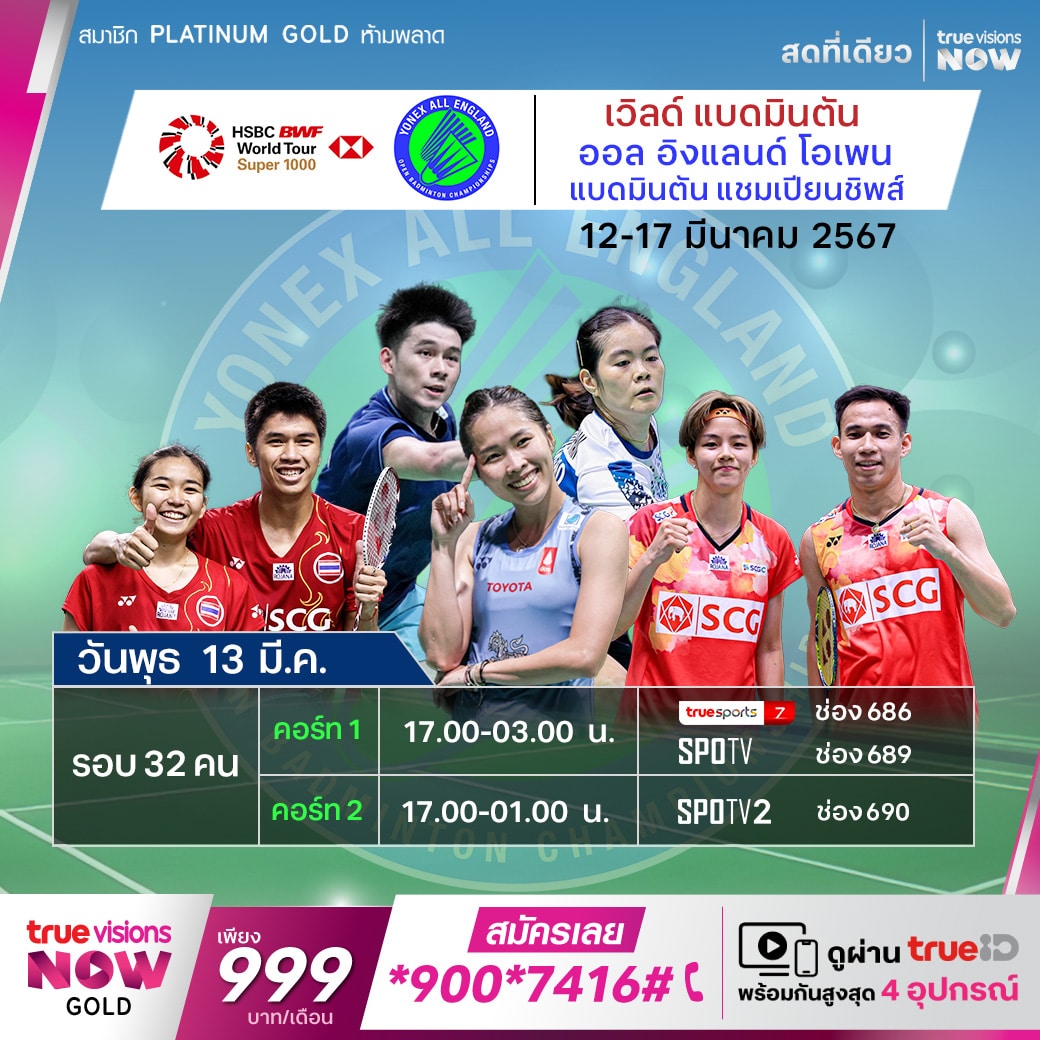 โปรแกรมการแข่งขัน แบดมินตัน รายการ “โยเน็กซ์ ออล อิงแลนด์ โอเพ่น แบดมินตัน แชมเปี้ยนชิพ 2024” แข่งขันวันที่ 12-17 มีนาคม 2567