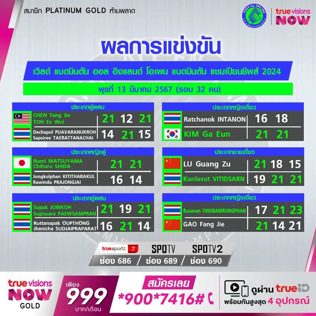 ผลการแข่งขัน ออล อิงแลนด์ โอเพ่น 2024 ของนักกีฬาไทย วันพุธที่ 13 มีนาคม 2567