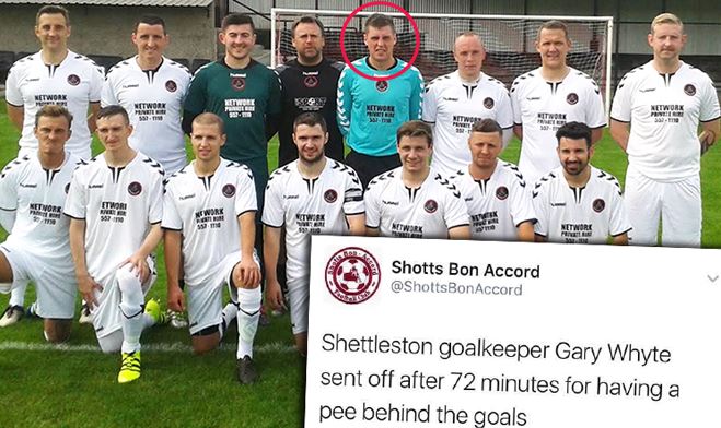แกรี่ ไวท์ ผู้รักษาประตูดาวรุ่งชาวสกอตแลนด์ของ เชตเทิลสตัน ทีมในดิวิชั่นหนึ่ง สกอตติช ซูเปอร์ลีก ฝั่งตะวันตก ลีกลูกหนังระดับเยาวชนแดนวิสกี้ โดนใบแดงไล่ออกจากสนาม หลังไปปัสสาวะบริเวณหลังประตู ระหว่างเกมกับ ช็อตส์ บอน แอ็คคอร์ด