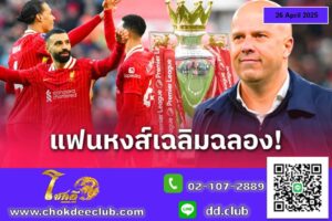 ลิเวอร์พูล ต้องการเพียง 1 คะแนนจากเกมเปิดบ้านพบ สเปอร์ส เพื่อคว้าแชมป์พรีเมียร์ลีก 2024/25 ต่อหน้าแฟนบอลที่แอนฟิลด์ มาดูกันว่า 5 สิ่งที่แฟน “เดอะ ค็อป” เฝ้ารออยากเห็นในค่ำคืนประวัติศาสตร์นี้มีอะไรบ้าง ลิเวอร์พูล จ่อคว้าแชมป์พรีเมียร์ลีก อังกฤษ ประจำฤดูกาล 2024/2025 โดยพวกเขาต้องการแค่คะแนนเดียวในเกมกับ ท็อตแน่ม ฮ็อทสเปอร์ ก็เพียงพอที่จะได้เฉลิมฉลองกันอย่างเต็มที่ ปัจจุบัน ทัพ “หงส์แดง” รั้งตำแหน่งจ่าฝูงด้วยการมี 79 คะแนน ทิ้งห่าง อาร์เซน่อล 12 คะแนน และในแมตช์รับมือ สเปอร์ส พวกเขาขอแค่เสมอเป็นอย่างน้อยก็เพียงพอที่จะได้ผงาดคว้าแชมป์ลีกสูงสุดสมัยที่ 20 ทันที เกมวันอาทิตย์ที่ 27 เมษายนนี้มีความสำคัญอย่างมาก เพราะถ้าทุกอย่างเป็นไปตามที่คาดหวังเอาไว้ ลิเวอร์พูล จะฉลองแชมป์ลีกต่อหน้าสาวก “เดอะ ค็อป” ในแอนฟิลด์เป็นครั้งแรกนับตั้งแต่เดือนเมษายน 1990 ซึ่งตอนนั้นพวกเขาเอาชนะ ควีนส์พาร์ค เรนเจอร์ส และคว้าแชมป์ดิวิชั่น 1 (ปัจจุบันเปลี่ยนชื่อเป็นพรีเมียร์ลีก) ที่สำคัญมันจะเป็นการฉลองที่สมบูรณ์แบบอย่างยิ่ง […]