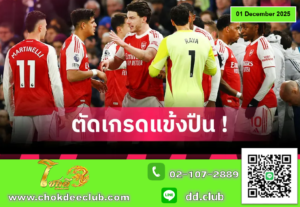 อาร์เซน่อล พลาดโอกาสเก็บชัยชนะในเกมลอนดอน ดาร์บี้ หลังมีผู้เล่นมากกว่า เชลซี ตั้งแต่ช่วงครึ่งแรก แต่โดนทำประตูนำไปก่อนในครึ่งหลัง แต่ยังดีที่ มิเกล เมรีโน่ ช่วยทำประตูตีเสมอ แม้ทัพ “ปืนใหญ่” จะสร้างโอกาสหวาดเสียวได้หลายครั้ง แต่สุดท้ายก็ไม่สามารถเพิ่มสกอร์ได้ จบเกมเสมอกัน 1-1 แบ่งแต้มกันไปในศึกพรีเมียร์ลีก อังกฤษ ที่สนามสแตมฟอร์ด บริดจ์ เมื่อวันอาทิตย์ที่ 30 พฤศจิกายนที่ผ่านมา ตัวจริง ดาบิด ราย่า : 7 มีจังหวะเซฟสำคัญก่อนที่จะเสียประตูแรก แต่จะโทษเขาไม่ได้ หลังจากนั้นก็สามารถทำหน้าที่ได้ดี โดยเฉพาะการเปิดบอลแม่นยำและการออกมาตัดบอลเร็ว เยอร์เรียน ทิมเบอร์ : 7 มีจังหวะสกัดสำคัญใส่ เอ็นโซ่ เฟร์นานเดซ ช่วงครึ่งแรก ทำผลงานได้โดดเด่น เล่นได้แข็งแกร่ง ครองบอลนิ่ง พยายามช่วยทีมบุกเข้าไปในพื้นที่สุดท้ายเชลซี หลายครั้ง คริสเตียน มอสเกร่า : 5 มีอาการประหม่าในบ้างครั้งเมื่อต้องเผชิญหน้ากับแนวรุกที่จัดจ้านของเชลซี เปิดช่องให้คู่แข่งโจมตีได้ตลอดทั้งเกม แม้ว่าเชลซีจะเหลือผู้เล่นเพียง 10 […]