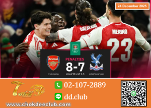 อาร์เซน่อล ตบเท้าผ่านเข้าสู่รอบรองฯ คาราบาว คัพ ได้สำเร็จ จากการดวลจุดโทษโค่น คริสตัล พาเลซ แบบสุดระทึก 8-7 หลังเสมอกัน 1-1 ใน 90 นาที โดย เกปา อาร์รีซาบาลาก้า สวมบทฮีโร่ เซฟลูกจุดโทษสุดท้าย ศึก คาราบาว คัพ รอบ 8 ทีมสุดท้าย คืนวันอังคารที่ 23 ธ.ค. 68 อาร์เซน่อล เปิด เอมิเรตส์ สเตเดี้ยม ดวล คริสตัล พาเลซ ทีมร่วมกรุงลอนดอน เพื่อแย่งตั๋วรอบรองชนะเลิศ เข้าไปพบกับ เชลซี อีกทีมจากเมืองหลวงที่ยืนรออยู่แล้ว ช่วงครึ่งแรกยังไม่มีประตูเกิดขึ้น แต่ อาร์เซน่อล มีโอกาสเยอะมาก โดยเฉพาะ โนนี มาดูเอเก้ ที่มีจังหวะยิงน่าเป็นประตูหลายครั้ง รวมถึงลูกโหม่งของ กาเบรียล เชซุส ช่วงครึ่งหลัง พาเลซ […]